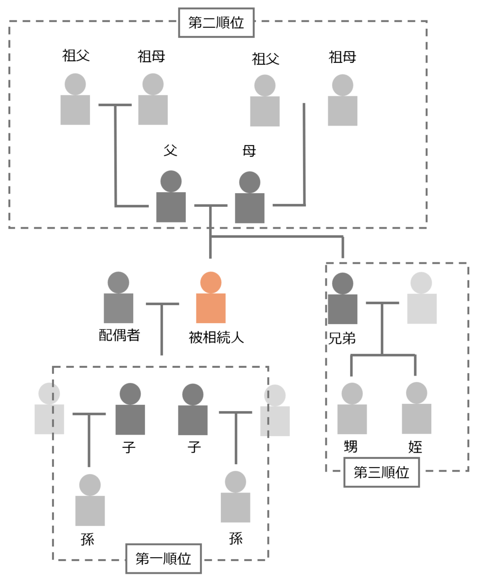 配偶者は常に相続人となり、子や父母、兄弟姉妹などの血族は順位に従います。養子や婚外子も含まれます。