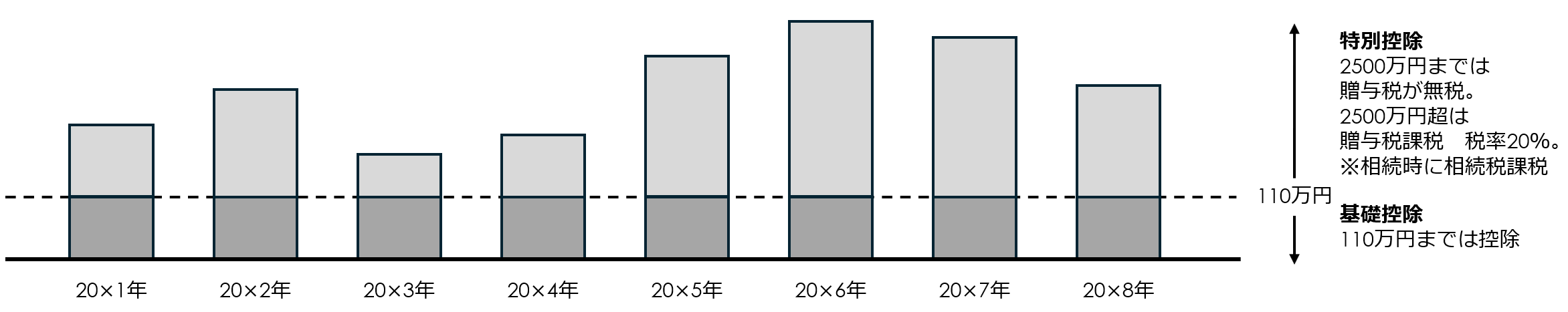2,500万円を超えた部分は、一律20%の贈与税がかかります。