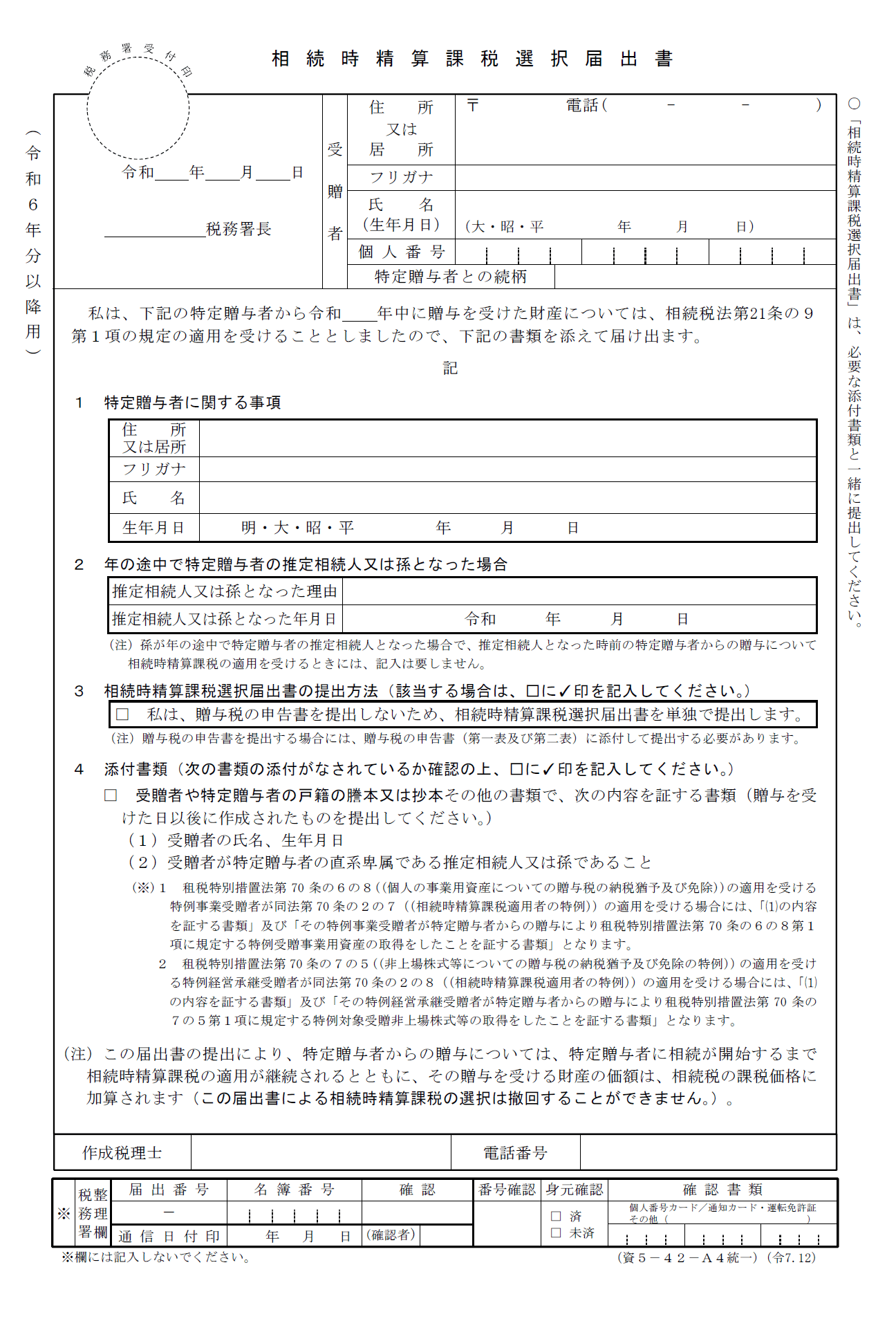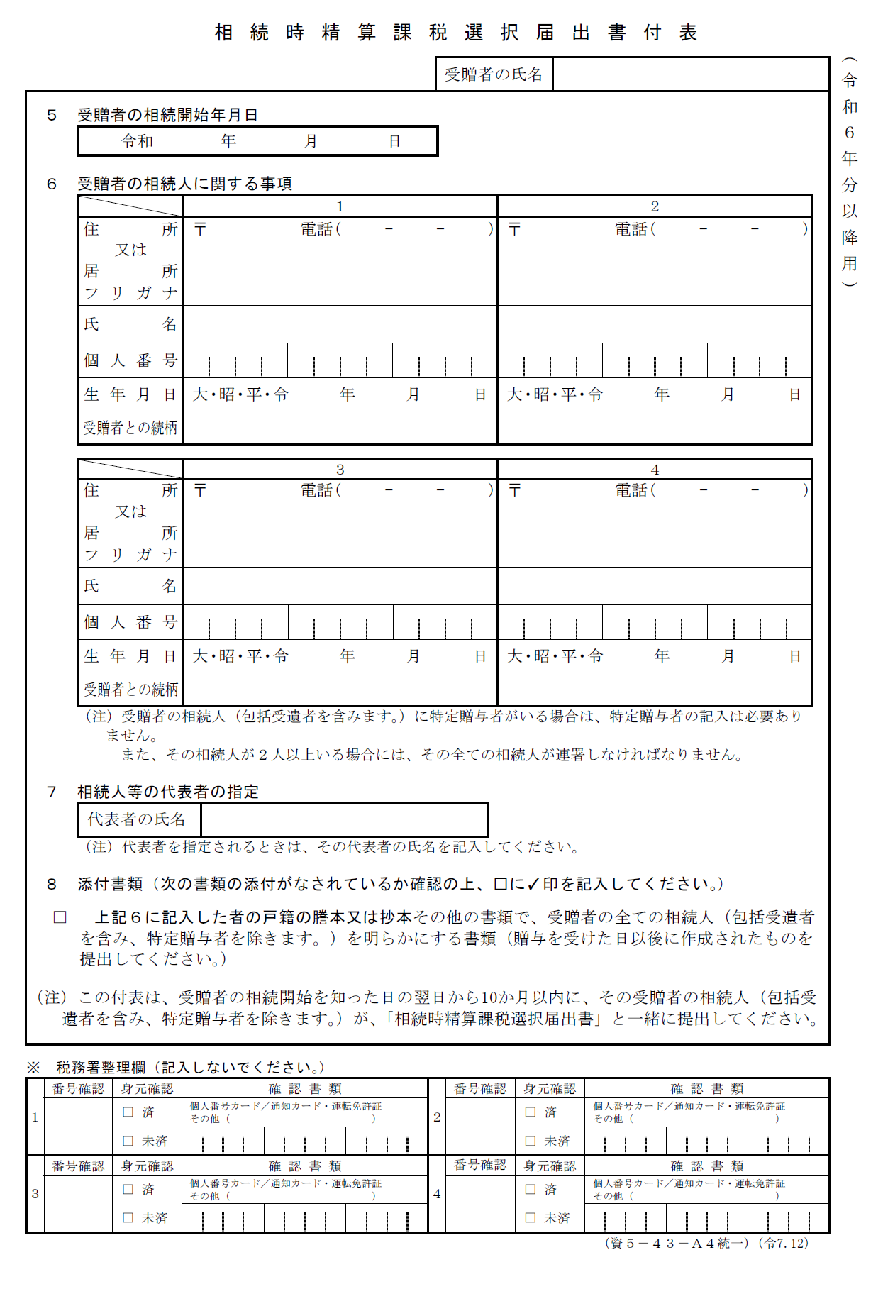 一定の書類は、相続時精算課税選択届出書付表と戸籍の謄本又は抄本、その他書類で受贈者の全ての相続人(包括受遺者を含み、特定贈与者を除きます)を明らかにする書類(贈与を受けた日以後に作成されたもの)です。